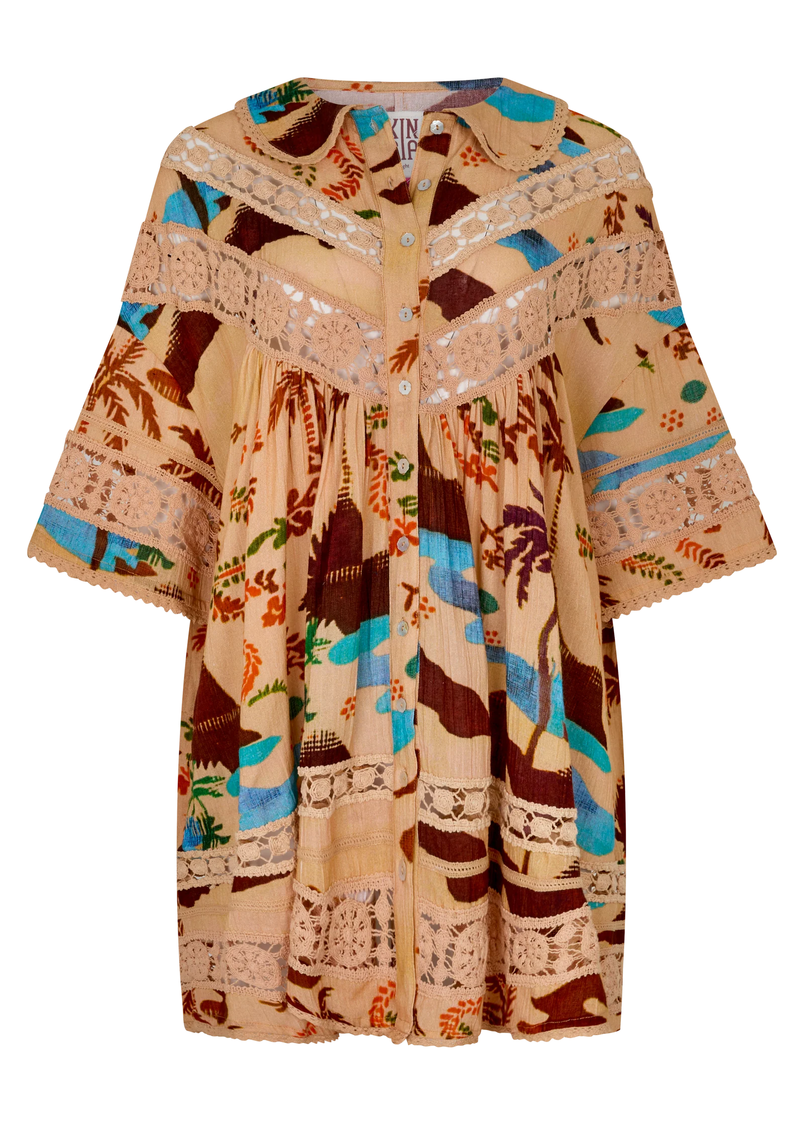 Cut from lightweight cotton and patterned with palm motifs, it’s finished with delicate crochet lace and a scalloped collar.